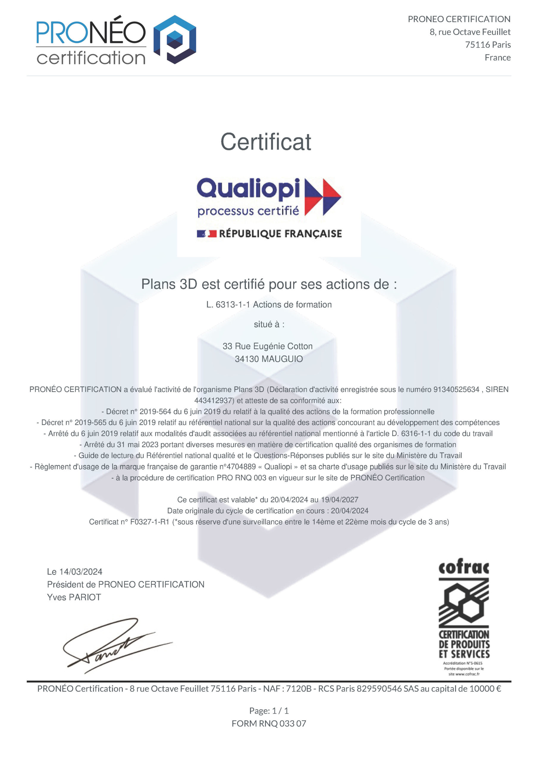 PLANS 3D est certifiée QUALIOPI depuis le 20/04/2021